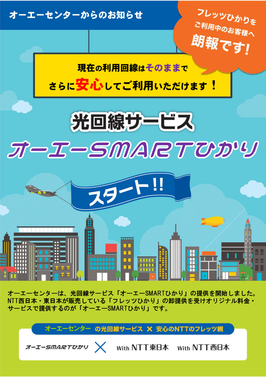 NTT西日本・東日本が販売している「フレッツひかり」の卸提供を受け、オーエーセンターがオリジナル料金・サービスで提供している光回線サービスです。